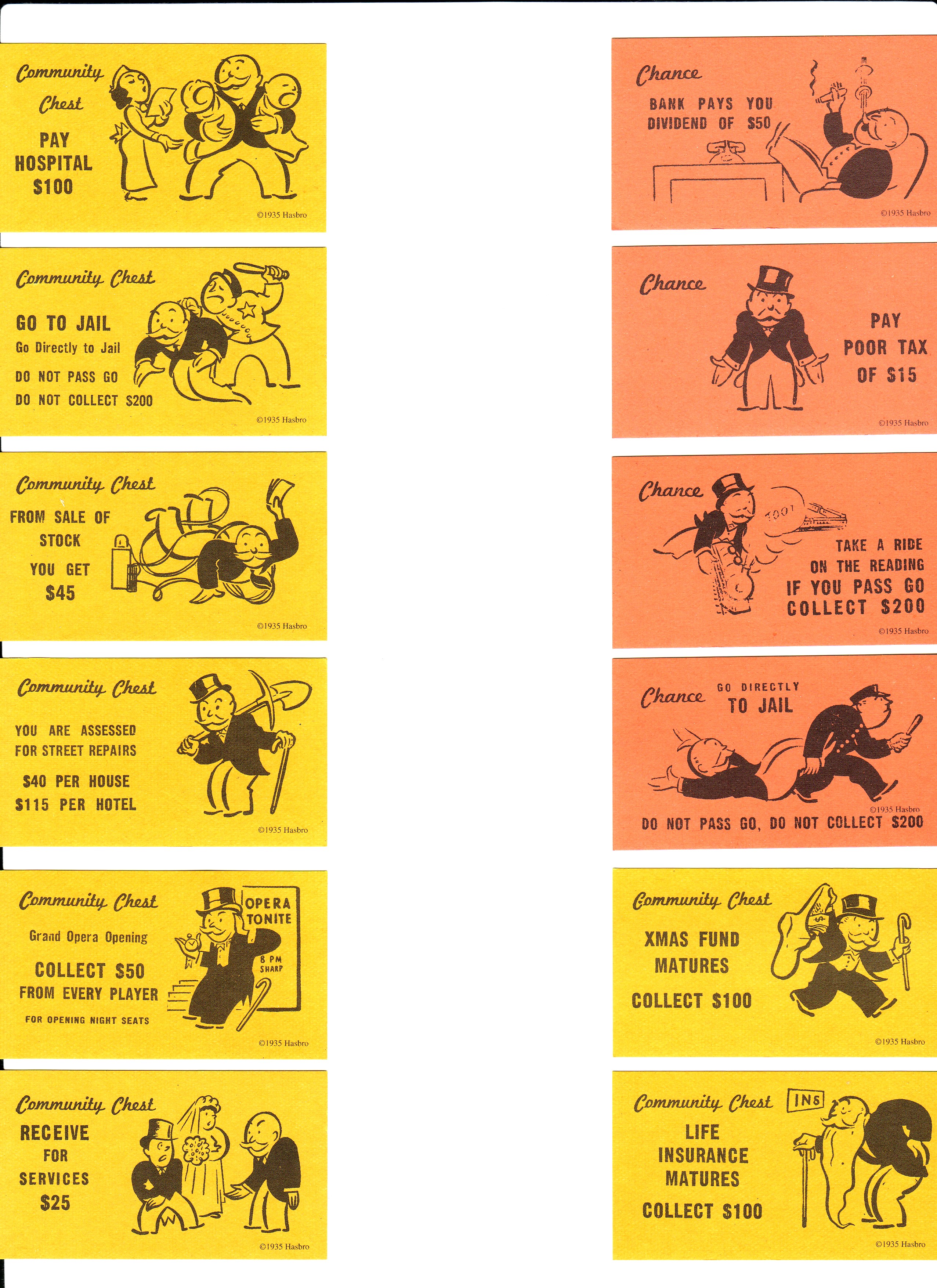 They originated with only the the player draws one of these cards when the player's token lands on one of the respectively named spaces on the monopoly board and must follow its instructions. The chance and community chest cards face down on their allotted spaces on the board. The monopoly name and logo, the distinctive design of the game board, the four corner squares, the mr. Arguably, the worst cards to get are the general repairs (chance deck) and street repairs (community chest deck), especially late in the game when you've but on the other hand, if your opponent gets the repairs cards and they're fully invested in houses/hotels, them pulling that card may swing the. The world has changed a lot since monopoly became a household name more than 85 years ago, and clearly today community is more important than ever, said eric nyman, chief consumer officer at. True to its longstanding history of inviting its fans to help make changes to the game, and during a time when community means more than ever before, monopoly. The toy company announced last week that it is changing all 16 of the game's community chest cards to better reflect what community means to fans today. Monopoly is giving its community chest cards a refresh. Pick the card from each matchup you would like to see in the next community chest deck & help mr. Monopoly name and character, as well. Cards measure approximately 1 3/4 x 3 all monopoly pieces. Can you name the words from each monopoly community chest card that was in the us edition from 1936 to 2008? Previous community chest cards included a bank error in your favor for a $200 gain, second prize in a beauty contest for $10 and a $50 doctor's fee. monopoly was first released in 1935 and is now sold in dozens of languages in more than 100 countries.
